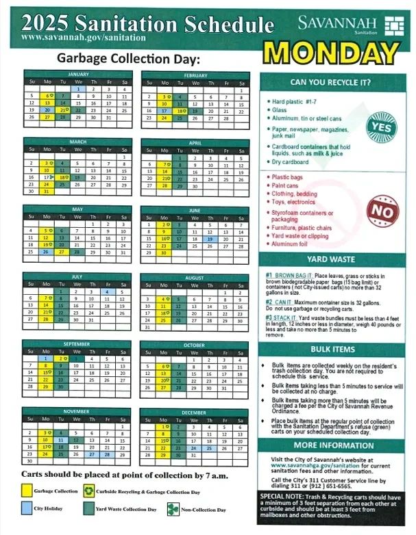 Household garbage is collected every Monday, except on City holidays. Please have cans at the road by 7:00 a.m.